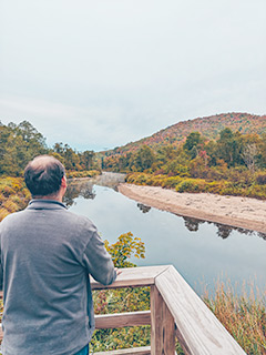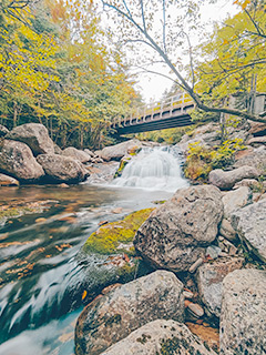 perspective : une rivière argentée, un pont de bois, une montagne au loin
